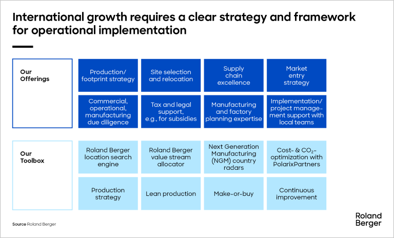 International growth is becoming a renewed priority for companies. Making it a success requires clear strategic thinking and efficient implementation. Thanks to our longstanding expertise, Roland Berger can support clients throughout this process by finding the right markets for expansion, driving change and implementation speed throughout an organization and by helping clients safeguard their supply chains and manufacturing footprint.