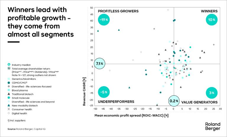 The Roland Berger Global Pharma Study 2024 analyzes the performance of more than 150 of the largest listed pharmaceutical and life-science companies, identifying those whose profitability and sales growth outperform the industry average and deliver superior shareholder returns as a result. Our analysis reveals the four common characteristics of these pharma “winners” – and what their peers can learn from them.