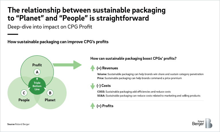 Roland Berger recognizes the challenges of pursuing more complex sustainable packaging. But we have also observed real substance to the movement. More specifically, sustainable packaging can demonstrably improve CPG revenues, market share, segment penetration, and premium pricing—this is in addition to the straightforward benefits that sustainable packaging innately has on “people” and the “planet” (aka Triple Profitability).