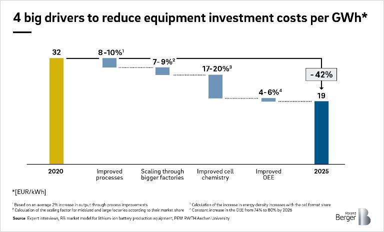 The current study drills down into specific things Europe’s players can do to quickly get their foot in this door. Costs – both capex and running costs – are naturally an issue, and the study reveals four distinct levers to bring much-needed improvements and make home-grown suppliers more competitive. Innovative advances in process engineering should be coupled with techniques to increase each cell’s energy yield. A long, hard look must also be taken at overall equipment effectiveness. The scale of production, as ever, is another parameter that merits attention. Aside from costs, however, there is also the question of strategic focus, with battery production holding out the greatest potential.
