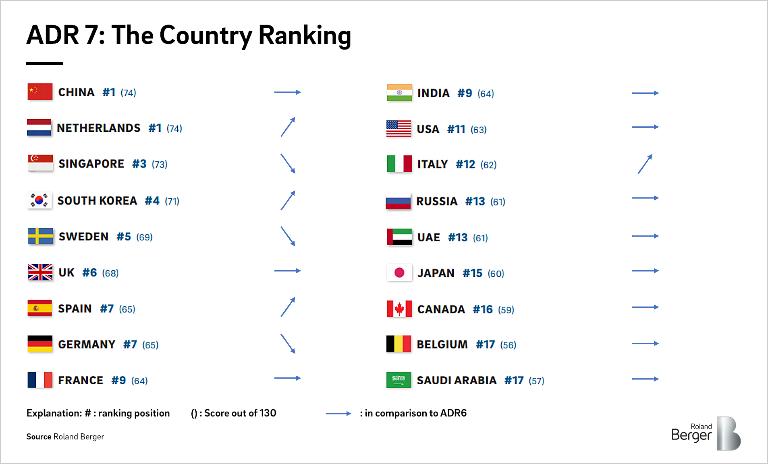 The ADR is a biannual analysis of market trends related to disruption in the global automotive industry. Its latest findings are based on field research and a survey of over 17,000 car users across 18 markets (Belgium, Canada, China, France, Germany, India, Italy, Japan, the Netherlands, Russia, Saudi Arabia, Singapore, South Korea, Spain, Sweden, United Arab Emirates, United Kingdom, USA). The 26 indicators of ADR are grouped into five dimensions: customer interest, regulation, technology, infrastructure and industrial activity.