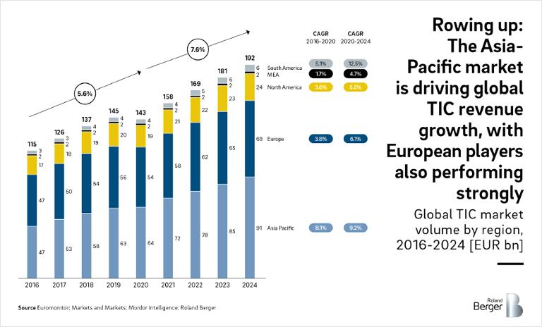 After COVID, the global TIC industry continues to show solid growth prospects. The market volume is forecasted to rise from EUR 143 billion in 2020 to EUR 192 billion in 2024, with an average growth rate of around 7.6% in the same period. While for many European TIC players Europe is the most important market, Asia Pacific continues to be largest overall TIC market, with rapid industrialization in the infrastructure, energy and transport sectors (especially in China and India) generating considerable opportunities for TIC services. South America, the second smallest TIC market behind the Middle East and Africa, will grow the fastest, at a rate of 12.5%. Overall growth predictions for the TIC market are further in line with past performance, at around 3% above GDP growth.