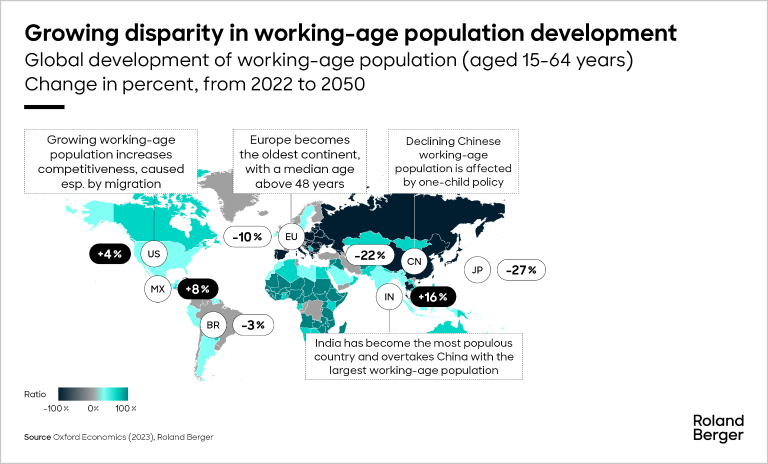 Labor scarcity is the situation where the demand for labor exceeds the supply, resulting in difficulties to fill vacancies, and thus to fully deliver business goals and to drive growth. According to a survey by the ifo Institute, 57% of metalworking companies in Germany reported operational difficulties due to staffing shortages in 2022, and the average time to fill a position was four months. The situation is expected to worsen in the coming years with the working-age population in the EU projected to decline 10% by 2050. Meanwhile, other regions such as India, the US, and Sub-Saharan Africa will see their workforces grow.