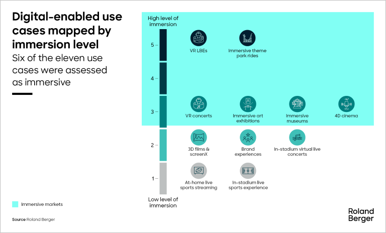 At Roland Berger, we “get” immersive entertainment. We recognize that it’s not about escape rooms or clever lighting, but spellbinding experiences driven by cutting-edge technology that engage the senses and transport the user to a different world. Immersive theme-park rides or virtual reality (VR) concerts, for example. With this definition in mind, we developed a framework to evaluate different experiences and distinguish immersive experiences from experiential ones.