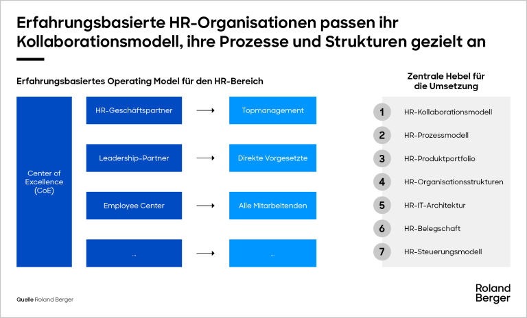 Für das Personalwesen bedeutet dies, dass es die Erfahrung von Mitarbeitern und Führungskräften deutlich mehr in den Blick nehmen muss. Erfolgreiche erfahrungsbasierte HR-Organisationen legen ihr Kollaborationsmodell, ihre Prozesse und Strukturen so aus, dass sie den tatsächlichen Bedürfnissen von Personalwesen, Management und Mitarbeitenden entsprechen. Zugleich arbeiten sie eng mit der IT zusammen, um durch Automatisierung und Skalierbarkeit mehr Effizienz zu erzielen und die HR-Teams in die Lage zu versetzen, Mitarbeitende und Führungskräfte bei Bedarf weiter zu qualifizieren.