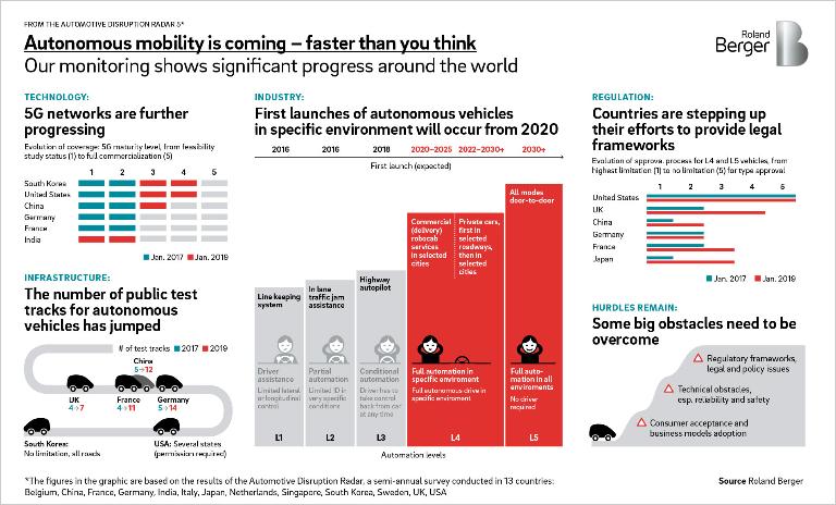 Der Übergang zur autonomen Mobilität wird sich nicht über Nacht vollziehen – aber er geht deutlich schneller als angenommen, auch wenn der durch unrealistische Ankündigungen angefeuerte mediale Hype langsam abklingt. Das ist eines der wichtigsten Ergebnisse des aktuellen Automotive Disruption Radars, mit dem Roland Berger alle sechs Monate den weltweiten Stand der Entwicklung im Bereich autonome Mobilität untersucht. Wie die aktuelle fünfte Ausgabe zeigt, gibt es an fast allen Fronten große Fortschritte, sei es bei Gesetzgebung, Infrastruktur, Investitionen oder beim Interesse der Kunden.