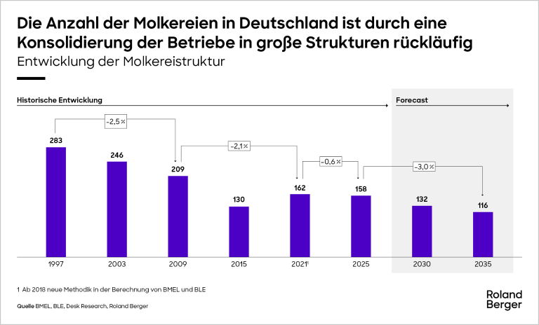 Die Konsolidierung der deutschen Milchwirtschaft schreitet in hohem Tempo voran. So ist die Zahl der Milchviehbetriebe von rund 94.000 im Jahr 2010 auf circa 50.000 im Jahr 2024 gesunken – ein Rückgang von mehr als 55 Prozent in nur 13 Jahren. Gleichzeitig ist die Gesamtmilchmenge mit rund 32 Mio. Tonnen stabil geblieben. Auf der Verarbeitungsseite hat sich die Zahl der Molkereien nahezu halbiert. Prägende Fusionen wie der geplante Zusammenschluss von Arla Foods und DMK zur größten Molkereigenossenschaft Europas verdeutlichen die Dynamik. Unsere Analyse zeigt: Unternehmen brauchen einen Umsatz von mindestens 250 Mio. EUR, um im Lebensmitteleinzelhandel dauerhaft relevant zu bleiben und mit ausreichend Verhandlungsmacht ausgestattet zu sein. Doch Größe allein reicht nicht. Genauso entscheidend ist eine klare Differenzierung über regionale Verankerung oder funktionale Produktalleinstellung. Roland Berger begleitet Unternehmen bei der Entwicklung und Umsetzung von Wachstumsstrategien, M&A-Identifikation und strategischer Positionierung.