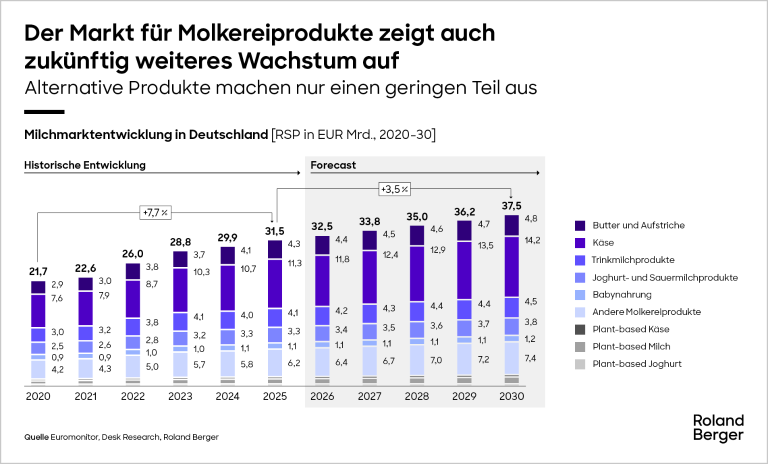 Die deutsche Molkereiwirtschaft befindet sich in einer Phase des tiefgreifenden Wandels. Neben allen fraglos bestehenden Risiken bieten sich auch attraktive Chancen – für alle, die bereit sind, jetzt entschlossen zu handeln. Erfolgreiche Molkereiunternehmen der Zukunft planen Volatilität strategisch ein, verbinden kritische Größe mit echter Differenzierung und erschließen neue Wachstumsfelder konsequent. Roland Berger begleitet Unternehmen in der Milchwirtschaft mit integrierter Beratungskompetenz – von der Strategie über operative Transformation bis hin zu konkreten digitalen Lösungen und unterstützt Sie bei Bedarf interimistisch auf C- und C-1 Level bei der Umsetzung nachhaltiger Veränderungen.