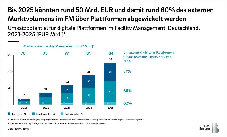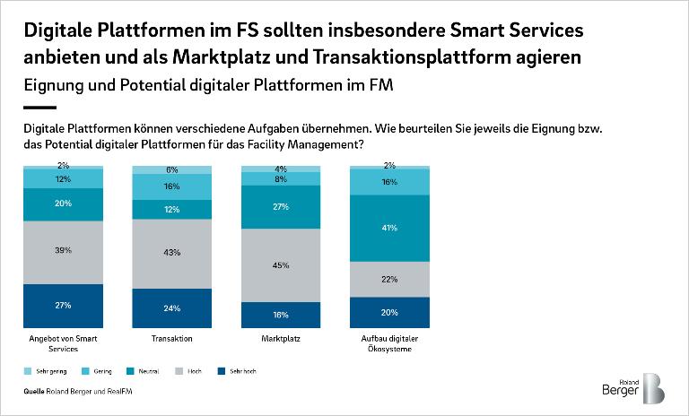 Roland Berger hat in einer Studie gemeinsam mit dem RealFM Verband und dessen Mitglieder die Möglichkeiten der digitalen Plattformökonomie im Facility Management untersucht. Das Ergebnis bestätigt sehr deutlich die Potenziale im Corporate Real Estate (CREM) und im Facility Management (FM). Digitale Plattformen werden insbesondere für das Angebot von Smart Services und die Funktion als Marktplatz und Transaktionsplattform gesehen.