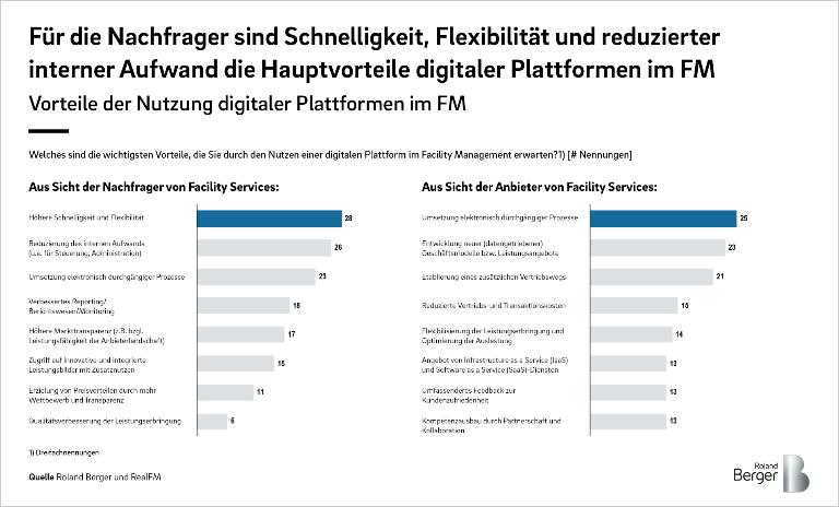 Sowohl Anbieter als auch Nachfrager von Facility Services erwarten signifikante Vorteile. Neben Kostenvorteilen und mehr Flexibilität, erwarten die Nachfrager eine schnellere Vertragsabwicklung, insbesondere auch für unplanbare Leistungen und die Beseitigung von Reklamationen und Mängeln. Die Anbieterseite sieht zudem erhebliche zusätzliche vertriebliche Perspektiven.