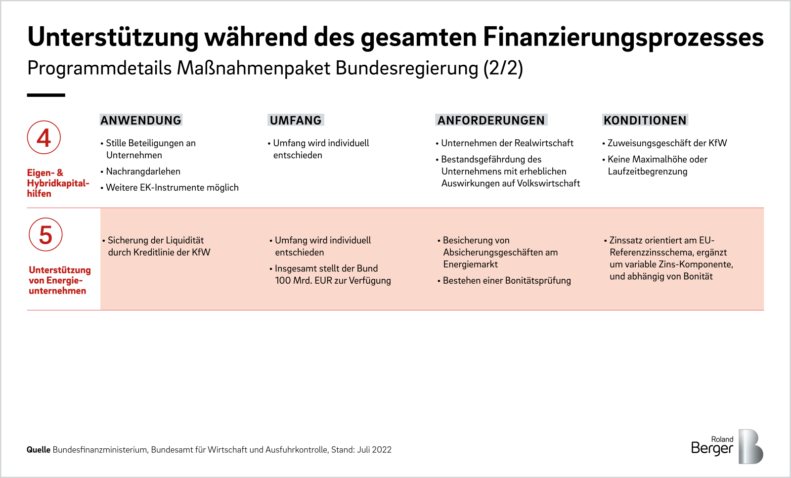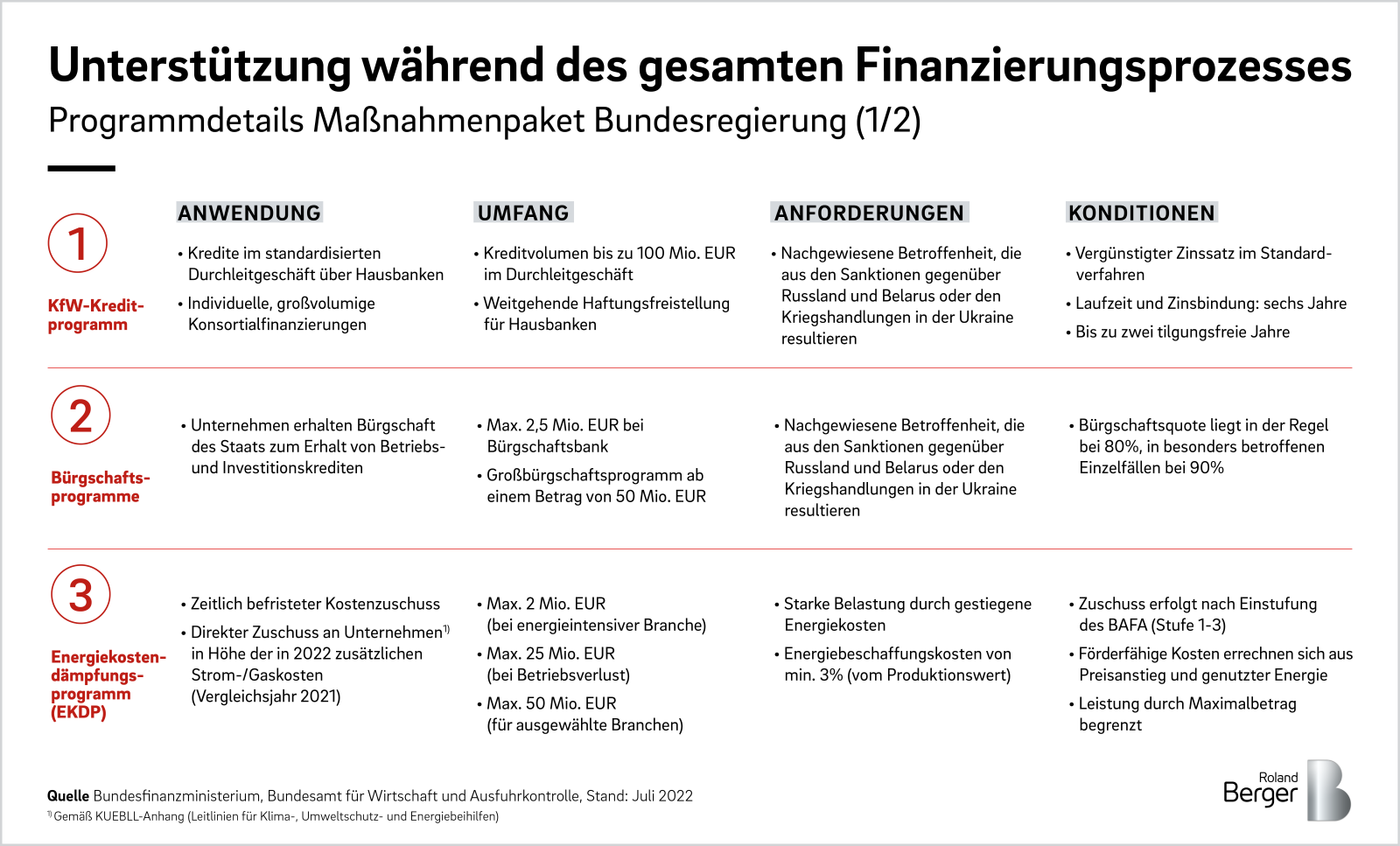 Unternehmen müssen daher handeln und alles daransetzen, die eigene Resilienz zu steigern und ihre Verwundbarkeit durch die Turbulenzen am Energiemarkt so weit wie möglich zu verringern. In erster Linie geht es darum, die Liquidität zu sichern, um mehr Spielraum im Umgang mit steigenden Kosten und Einkaufspreisen zu haben. Dafür braucht es interne Maßnahmen genauso wie die optimierte Inanspruchnahme des umfangreichen Maßnahmenpakets, das die Bundesregierung beschlossen hat, um den Fortbestand von Industrieunternehmen und Energieproduzenten zu sichern und Unterbrechungen der Wertschöpfungskette zu verhindern. Das Paket reicht von Krediten über Bürgschaften bis hin zu staatlichen Beteiligungen und Zuschüssen.