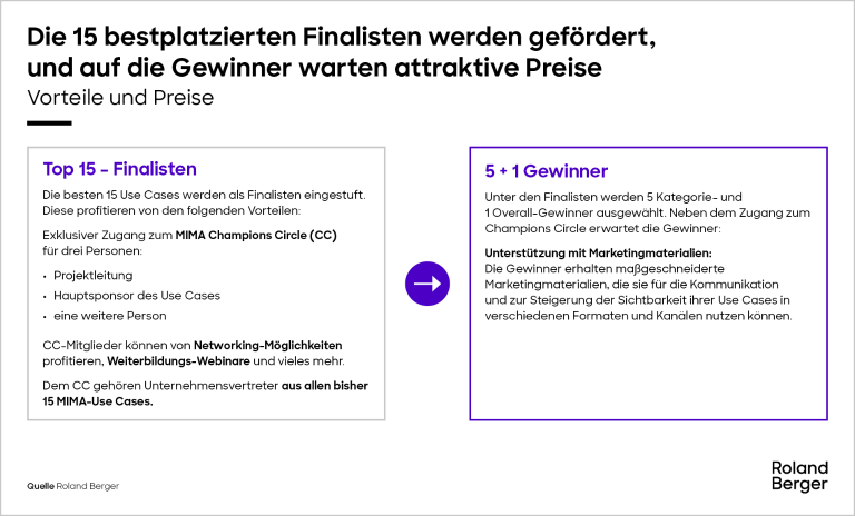 Die 15 besten Use Cases werden als Finalisten eingestuft. Die Finalisten erhalten Zugang um MIMA Champions Circle (CC). Sie werden außerdem in die externe Kommunikation eingebunden, um ihre Sichtbarkeit in der Branche zu gewährleisten.