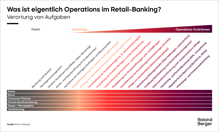 Operations-Funktionen im Banking umfassen eine Vielzahl an Tätigkeiten, die sich je nach Organisation erheblich unterscheiden. Sie stellen Back-Office-Prozesse dar, die den reibungslosen Ablauf des Bankgeschäfts sicherstellen und vorwiegend einfache, regelbasierte Tätigkeiten mit besonders hoher Stückzahl umfassen. Zumeist sind diese Funktionen in Finanzinstituten zentralisiert, aber auch teilweise an verschiedenen Stellen der Organisation verortet. Je nach Kundensegment ergeben sich spezifische Schwerpunkte der Operations-Aufgaben. Dazu gehören Zahlungsverkehr, Konto- und Kreditadministration, Betrugsprävention, regulatorische Meldungen, allgemeine administrative Themen im Zusammenhang mit Kundenbeziehungen sowie IT-gestützte Prozessautomatisierung und Effizienzsteigerung.