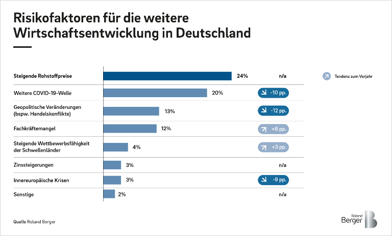 In der Verteuerung der Rohstoffpreise und Vorprodukte (25 %) sehen die Befragten das größte Risiko für die wirtschaftliche Erholung Deutschlands. Die Befürchtung: Unternehmen könnten dadurch gezwungen sein, ihre Produktion zu drosseln und Preiserhöhungen an die Kunden weiterzugeben – mit entsprechend negativen Folgen für die Geschäftsbilanz.
