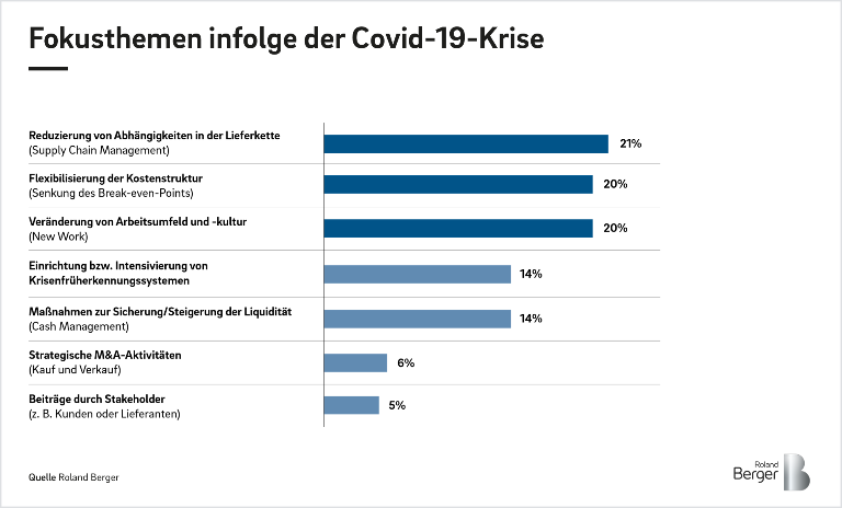 Für die Geschäftsführung von Unternehmen rücken nach Ansicht der befragten Fachleute infolge der Covid-19-Krise neue Themen in den Fokus: Allen voran geht es um mehr Flexibilität in den Lieferketten (21%) und in den Kostenstrukturen (20%), um resilienter bei externen Schocks zu sein. Für jeden fünften Experten gewinnen auch neue Arbeitsmodelle – „New Work“ – an Bedeutung. Der beschleunigten Veränderung des Arbeitsumfeldes und der Arbeitskultur durch die Corona-Pandemie wird hier Rechnung getragen.