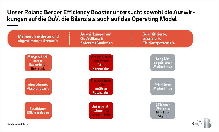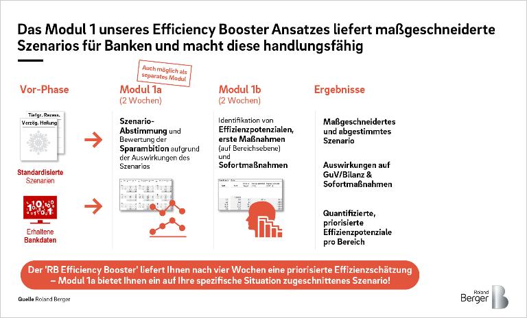 Der Roland Berger Efficiency Booster ist ein standardisierter und bewährter Ansatz, der eine einfache Integration Ihrer bankspezifischen Daten erlaubt und durch ein erprobtes Bündel an Werkzeugen schnell Resultate bringt. Bereits nach nur zwei Wochen haben Sie einen klaren Blick auf die Auswirkungen der aktuellen Entwicklungen auf Ihr Institut. Nach zwei weiteren Wochen sind die Handlungsfelder zur Hebung von Effizienzpotenzialen identifiziert und die Umsetzung kann starten.