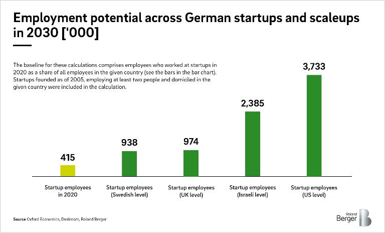 Rund 415.000 Menschen sind derzeit hierzulande bei Startups und Scaleups beschäftigt. Gelingt es Deutschland, das "Niveau" der USA – gemessen im prozentualen Anteil der in Startups und Scaleups Beschäftigten an der Gesamtbeschäftigung – zu erreichen, könnten es 2030 schon 3,7 Millionen sein.