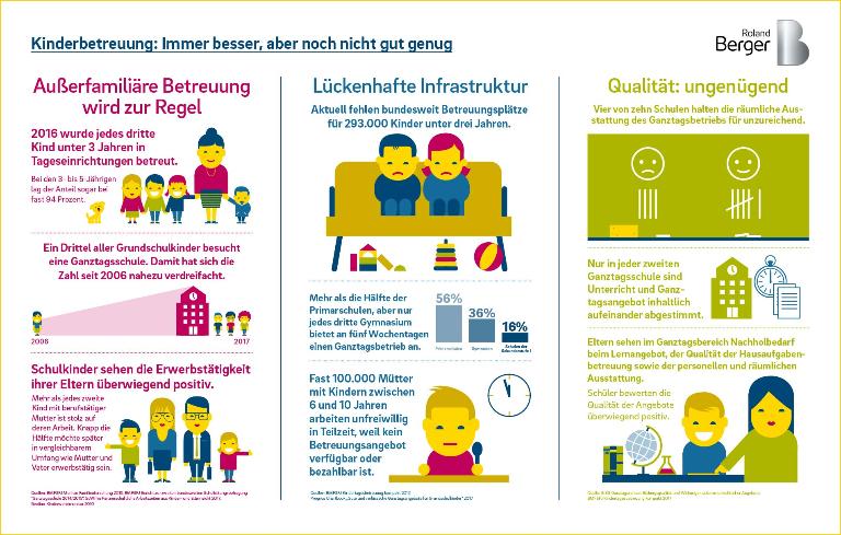 - Vereinbarkeit #3 - Ohne zuverlässige Kinderbetreuung keine Vereinbarkeit. Was so selbstverständlich klingt, ist es leider nicht. Denn auch wenn Deutschland seit der Einführung des gesetzlichen Betreuungsanspruchs für Kinder ab dem vollendeten ersten Lebensjahr im Jahr 2013 einen großen Sprung gemacht hat, gibt es nach wie vor erhebliche Defizite. So fehlen bundesweit fast 300.000 Betreuungsplätze für unter Dreijährige, weniger als ein Drittel der weiterführenden Schulen hat ein durchgängiges Betreuungsangebot am Nachmittag. Unsere dritte Infografik zeigt die Fortschritte – aber auch bestehende Herausforderungen.