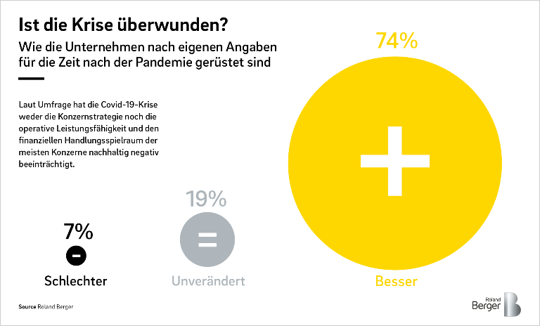 Roland Berger hat zum Jahresende 2021 im Rahmen der diesjährigen Performance-Umfrage 100 mehrheitlich gelistete Unternehmen der DACH-Region nach den erfolgreichsten Krisenmaßnahmen der zurückliegenden Monate, dem Status quo und den Herausforderungen für die Nach-Corona-Zeit befragt. Das Ergebnis erscheint auf den ersten Blick kontraintuitiv: Die Mehrheit der Umfrageteilnehmer gibt an, aktuell deutlich besser dazustehen als noch vor dem Ausbruch der Pandemie. Glaubt man der positiven Selbstauskunft, dann gehen die allermeisten Unternehmen sogar strategisch (66 Prozent), finanziell (80 Prozent) und in ihrer operativer Leistungsfähigkeit (91 Prozent) gestärkt aus der Krise hervor.
