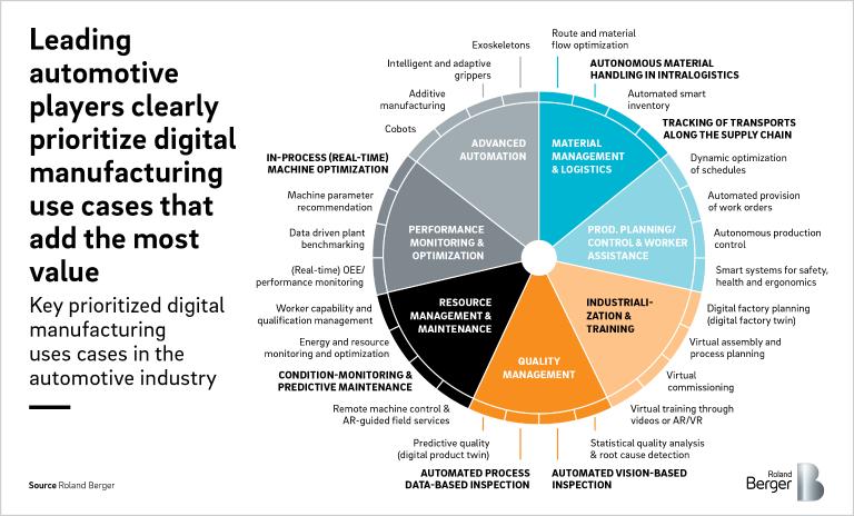 Nachdem Roland Berger zunächst sieben archetypische Anwendungsfälle in der Automobilindustrie identifiziert hatte, kristallisierten sich fünf konkrete Use Cases heraus, die von der Branche bis dato priorisiert werden. Alle fünf sind Unterkategorien der sieben archetypischen Anwendungsfälle. Sie lauten: Echtzeitoptimierung von Maschinenparametern, Zustandsüberwachung und prädiktive Wartung, automatisierte Qualitätsprüfung auf Basis von visuellen/Prozessdaten, autonomer Materialtransport in der Intralogistik sowie Transportverfolgung entlang der Lieferkette.