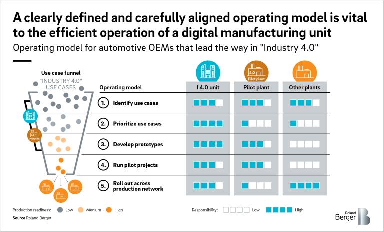 Mehr als eine Dekade später liegt die ursprüngliche Vision einer autonomen, hochflexiblen und selbstorganisierenden Fabrik noch immer in weiter Ferne. Um herauszufinden, an welchem Punkt die Industrie 4.0 tatsächlich steht, tauchte Roland Berger tief in die Materie ein. Dabei untersuchten unsere Experten, welche Anwendungsfälle im Fokus der Automotive-Unternehmen standen, wie weit diese fortgeschritten sind, welche Unterschiede es zwischen OEMs, OESs und verschiedenen Regionen gibt und wie diese Anwendungsfälle – parallel zu den notwendigen organisatorischen Veränderungen – in der Praxis weiterentwickelt und umgesetzt werden.