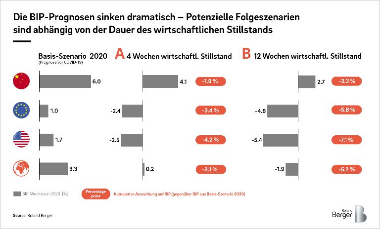 China befindet sich an einem späteren Punkt der Pandemiekurve als Europa oder die Vereinigten Staaten. Die Maßnahmen der Regierung waren effektiv, die Quarantäne konnte nach und nach aufgehoben werden, und das gesellschaftliche und wirtschaftliche Leben normalisiert sich zusehends. Bei einem vierwöchigen Stillstand der Wirtschaft wird China zwar die Folgen von geschlossenen Fabriken und sinkender Nachfrage aus den USA und Europa spüren; die angestaute Nachfrage der eigenen Bevölkerung und wichtiger Handelspartner, die den Lockdown bereits hinter sich haben (Japan, Südkorea), wird jedoch dazu führen, dass die Produktion schnell wieder auf ein normales Niveau zurückkehrt. Das Resultat ist ein Rückgang des BIP-Wachstums in 2020 um lediglich 1,9 Prozent gegenüber den ursprünglichen Prognosen. Bei einer Störung des Wirtschaftsgeschehens von zwölf Wochen bleibt die Nachfrage in Europa und den USA für längere Zeit schwach, und die Binnennachfrage kann dies nicht in vollem Umfang kompensieren. In diesem Fall wird sich das Wachstum des Bruttoinlandsprodukts um 3,3 Prozentpunkte reduzieren.