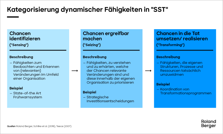 Im Kontext immer kürzerer (technologischer) Entwicklungszyklen werden dynamische Fähigkeiten immer wichtiger. Sie werden in drei Kategorien unterteilt: Sensing, Seizing und Transforming.