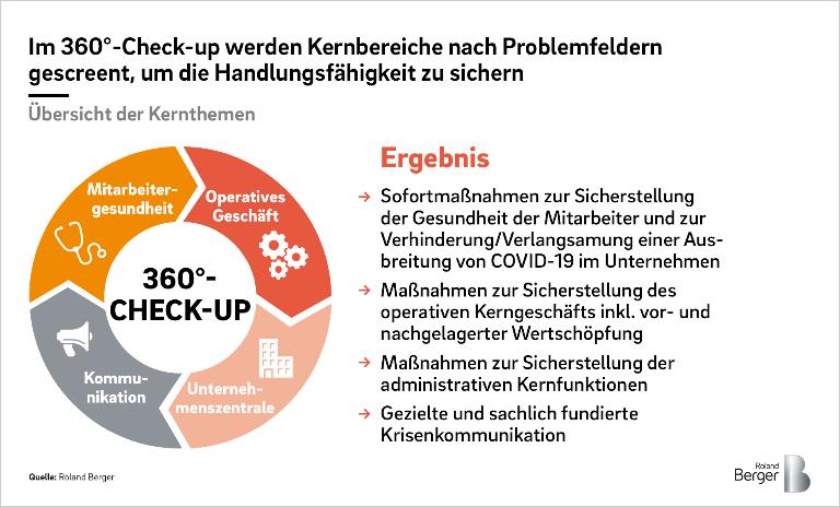 Der 360°-Check-up von Roland Berger hilft, operative und organisatorische Risiken im Zusammenhang mit COVID-19 zu erkennen. Pragmatische Checklisten helfen, vier Kernbereiche im Detail zu durchleuchten und den jeweiligen Handlungsbedarf aufzuzeigen.