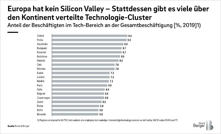 Entscheidend für eine wettbewerbsfähige Digitalwirtschaft sind innovative Technologien, Produkte und Geschäftsmodelle. Keine Region steht so für digitale Innovation wie das Silicon Valley. Etwas vergleichbares gibt es in Europa nicht, doch das muss kein Nachteil sein. Denn Europa verfügt über eine große Zahl an Tech-Clustern, die über den gesamten Kontinent verteilt sind. So liegen die 20 Regionen mit dem höchsten Anteil an Tech-Beschäftigten in 19 verschiedenen Ländern.
