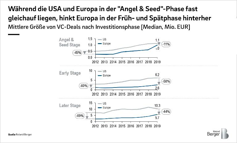Noch schlimmer: Während ein mittelgroßer Deal in der Angel- und Seed-Phase in Europa mittlerweile so groß ist wie in den USA, schließt sich die Lücke in der Later-Stage-Phase nur sehr langsam. Noch 2019 hat ein europäisches Startup in einer Later-Stage-Finanzierungsrunde im Mittel 44% weniger Wachstumskapital erhalten als ein Startup in den USA.