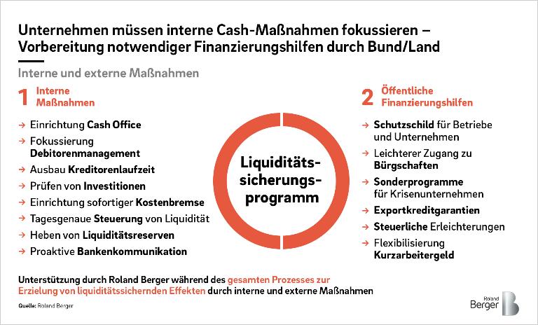 Das Liquiditätssicherungsprogramm von Roland Berger ermöglicht eine synchrone Umsetzung von internen und externen Maßnahmen, um die Zahlungsfähigkeit von Unternehmen in Krisen und Sondersituationen zu sichern. Der Aufbau eines Cash-Office wird für viele Unternehmen eine erforderliche Voraussetzung für die Liquiditätssicherung sein. Dazu kommen externe Maßnahmen wie die mögliche Inanspruchnahme öffentlicher Finanzierungshilfen insbesondere im Kontext der Corona-Krise (KfW- und Bürgschaftsprogramme). Wichtig ist, dass am Ende ein abgestimmtes Zusammenspiel aus allen notwendigen Maßnahmen stattfindet, um die Unternehmen mit der nötigen Liquidität auszustatten.