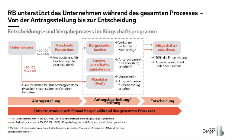Die Genehmigung eines solchen Antrags wird von der Höhe des Finanzbedarfs und der Krisenbewältigungsplanung abhängen. Roland Berger unterstützt Unternehmen im gesamten Prozess für öffentliche Finanzierungshilfen, mit der Dokumentation der Antragstellung zur Ermittlung des Liquiditätsbedarfs und bei dem Plan zur Krisenbewältigung. Neben den formalen Dokumentationsanforderungen koordiniert Roland Berger auch ein parallel stattfindendes Stakeholder-Management. Durch die Abstimmung der unterschiedlichen Interessenslagen der einzelnen Stakeholder wird die Zahlungsfähigkeit des Unternehmens zusätzlich gestützt.