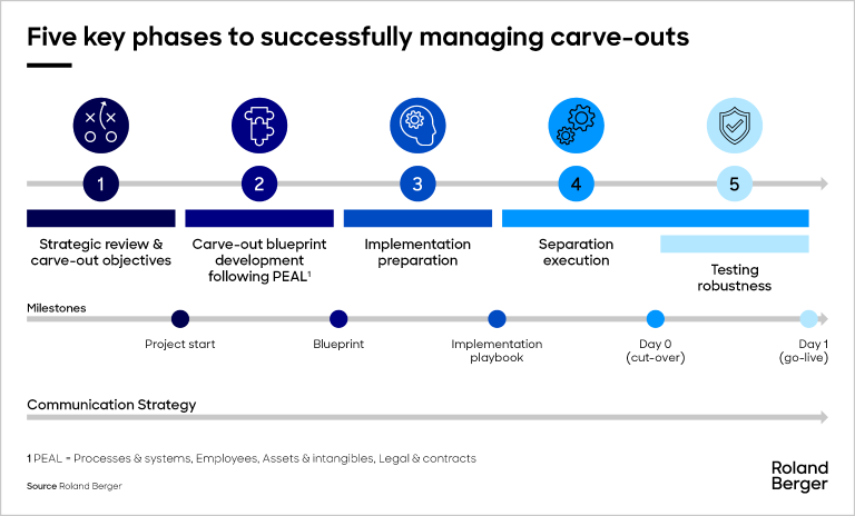 - Phase four is the execution phase, in which the company is carved out according to the blueprints, ensuring a smooth transition of the assets, operations and personnel to the new entity.