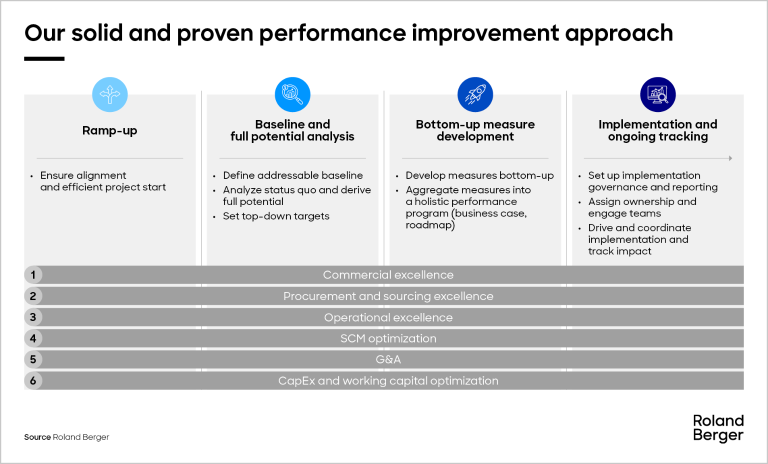 It is not the pure cost down within the status quo, especially as the easy lifts have been taken. The success of a sustainable performance optimization is a holistic program combining a real transformation of the company with tangible and measurable efficiency measures along the entire P&L: