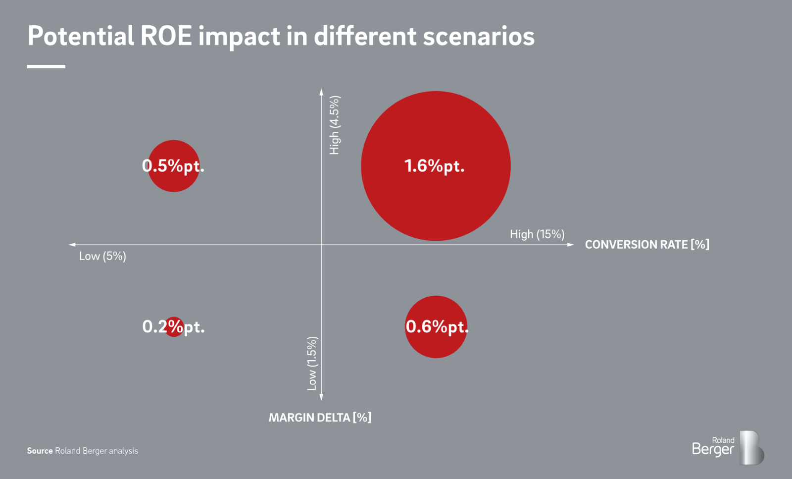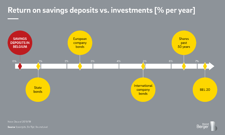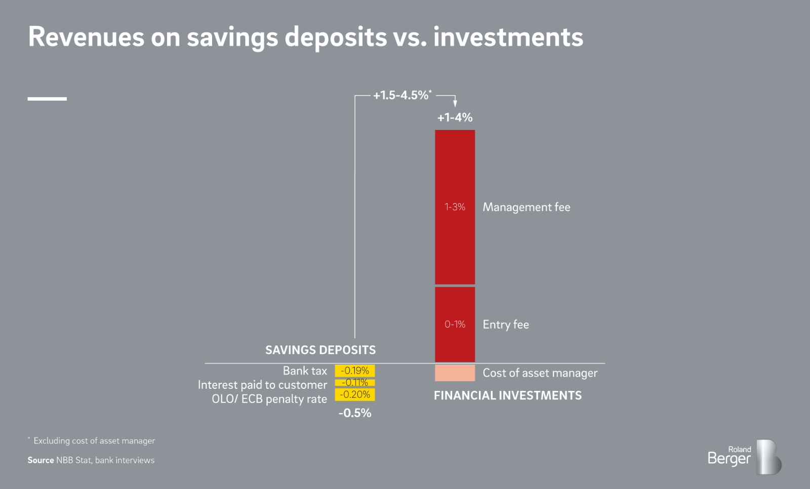 For Belgian banks the potential upside is very significant: If banks manage to convert part of their savings deposits into investments this would generate additional revenues of up to EUR 2 billion (depending on the success of the conversion-effort and the margin on the solutions used). At a time when profits of Belgian banks are under pressure, this could generate a positive impact on ROE of up to 1.6% points (assuming a 50% profit contribution of the fees paid on financial investment products).