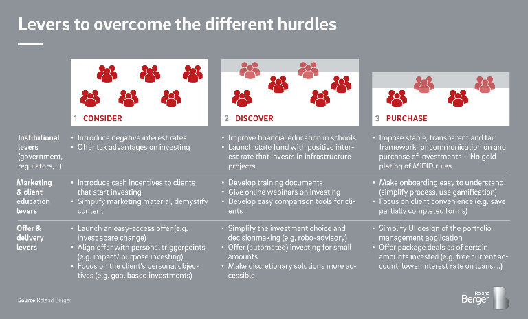 Banks that want to keep potential investors on board for the whole journey will have to provide solutions to overcome the different hurdles. The hurdles to focus on will differ from bank to bank. Yet a certain degree of maturity on each one of them will be needed to actually convert clients' savings deposits to financial investments. To help achieve this, Roland Berger has identified a set of potential levers for each of the hurdles along three different dimensions.