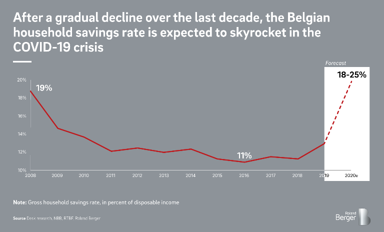 After a period of gradual decline, the Belgian household savings rate is soaring and expected to reach approximately 20% in 2020 in the wake of the Covid-19 crisis