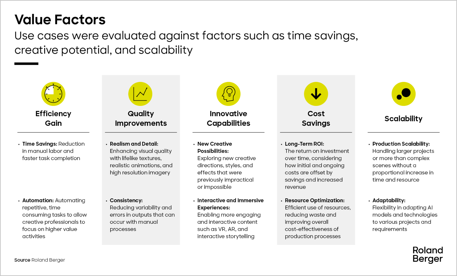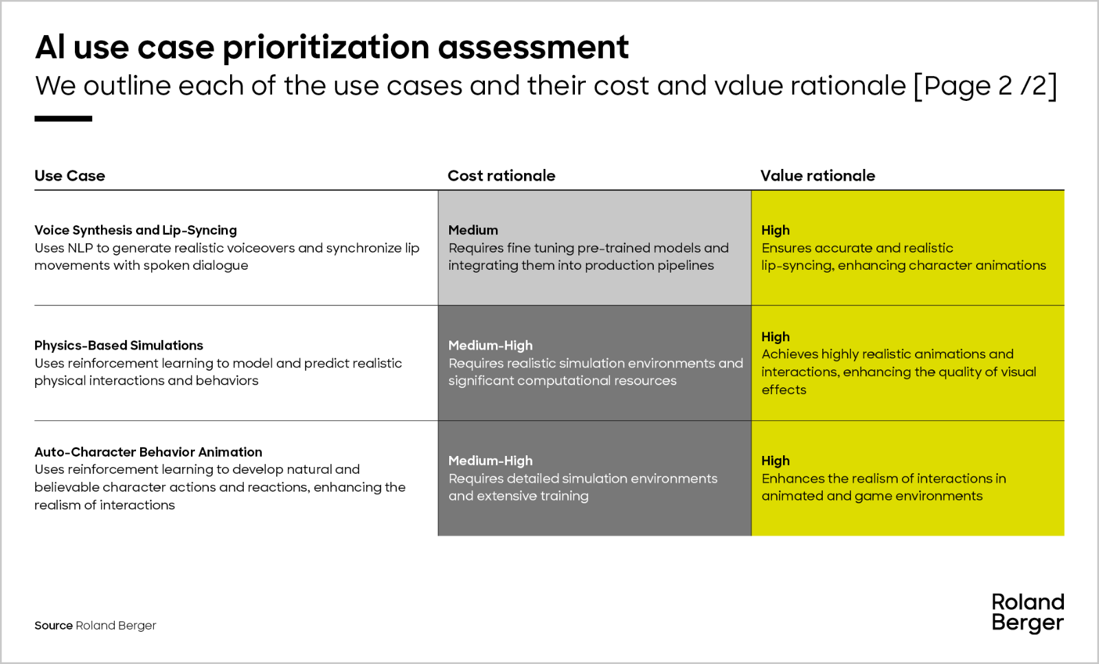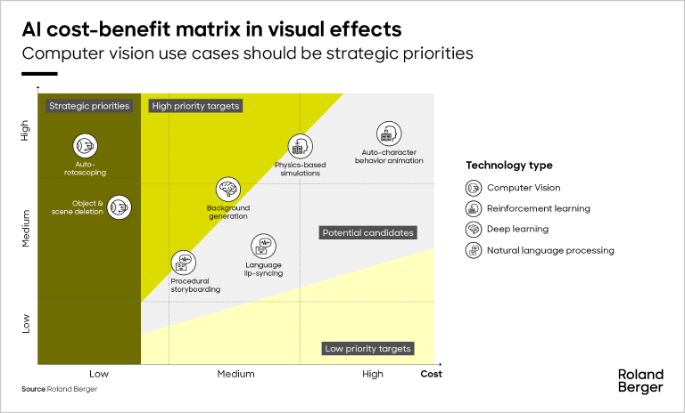 AI technologies offer immense value to the VFX and animation industry through substantial cost and time efficiencies, for example, by automating content creation, enhancing realism and enabling collaborative tools. While options for "quick win" and budget-friendly AI use cases are currently limited, there are numerous high-impact opportunities for pipeline enhancement.