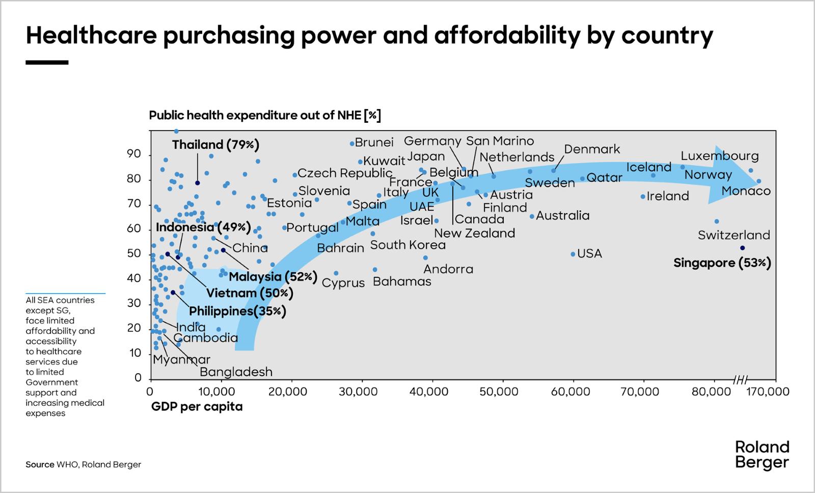 In Indonesia, Vietnam, and Philippines, public healthcare expenditure accounts for less than 50% of the National Health Expenditure (NHE), largely due to varying government and limited budgets. Singapore stands out among the SEA countries with the highest purchasing power, with a GDP of USD 84,734. Meanwhile, over 40% of the population in Thailand, Phillippines, Indonesia, and Vietnam earn less than USD 5,000 per year.