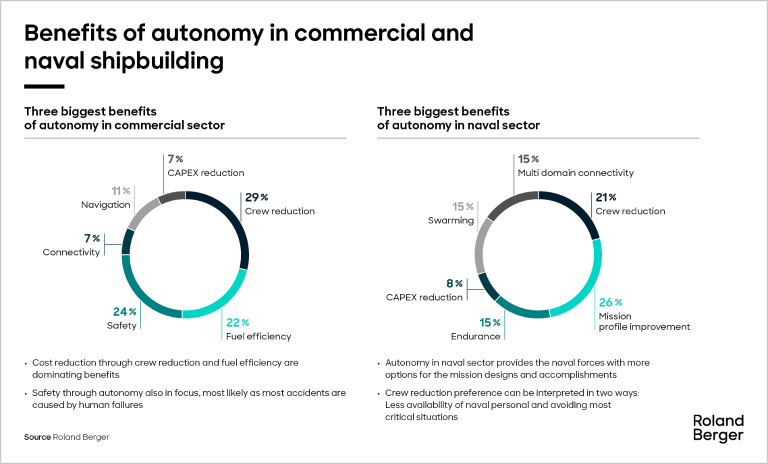 Rather than considering the economic benefits, military interest in autonomous vessels centers on operational advantages. Uncrewed vessels enable extended missions, reduce personnel exposure to dangerous situations, and provide new tactical capabilities through coordinated vessel operations. On the commercial side, autonomous systems offer potential solutions to challenges around the shortage of skilled workers and rising personnel and operational costs, including fuel consumption, while simultaneously addressing safety concerns, given that human error is a contributing factor in three-quarters of all maritime accidents.
