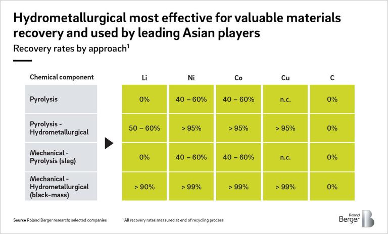 The EU has sufficient capacity for polymetallurgical recycling for 2020. Viewed against the target for recovered materials as laid down in the EU Battery Directive, however, the process has its limits: lithium and manganese cannot be recovered efficiently, so it is therefore not particularly economical. The situation is different with hydrometallurgical methods, which for the first time bring a closed loop recycling system within reach. High recovery rates have already been achieved in pilot projects under optimum conditions.