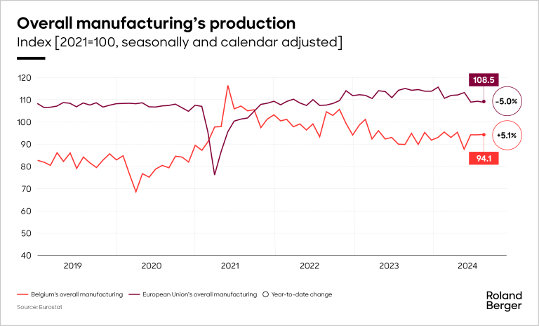 Belgium's industrial production, which surged in 2021 and 2022 on the back of vaccine manufacturing to combat COVID-19, has now settled on a lower plateau. Following a sharp contraction in 2023, the pharma sector rebounded strongly, while chemicals saw modest recovery. However, the automotive and mechanical engineering sectors continued to struggle. Looking ahead, Belgian industry is expected to regain momentum in 2025, supported by a restocking cycle and a broader recovery in the European industrial sector. Industrial production is set to rebound in 2025, with the EU projected to grow by 1.7% and Belgium expected to see a 1.2% increase, signaling recovery after a subdued 2024.