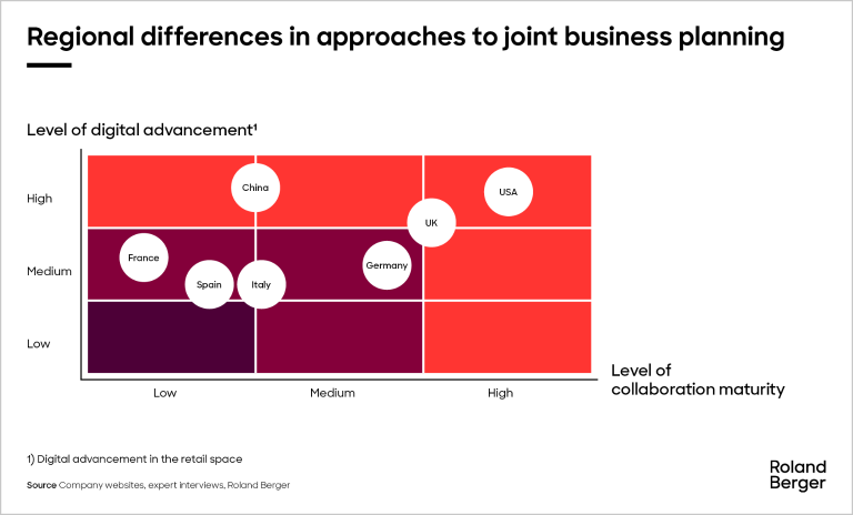 Our benchmark study found clear variations in the joint business planning practices adopted in different countries and regions. These differences center in particular around the level of digital advancement and, hence, how companies collaboratively harness data to add value. On the other hand, it is important to align collaborative approaches with any such regional differences and adopt the appropriate regional best practices to the according data use and collaboration maturity.