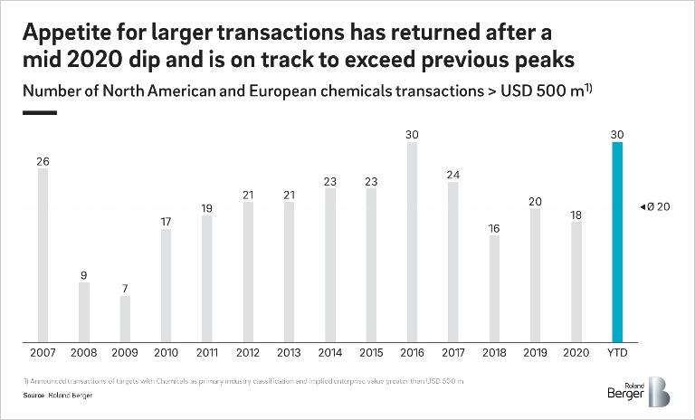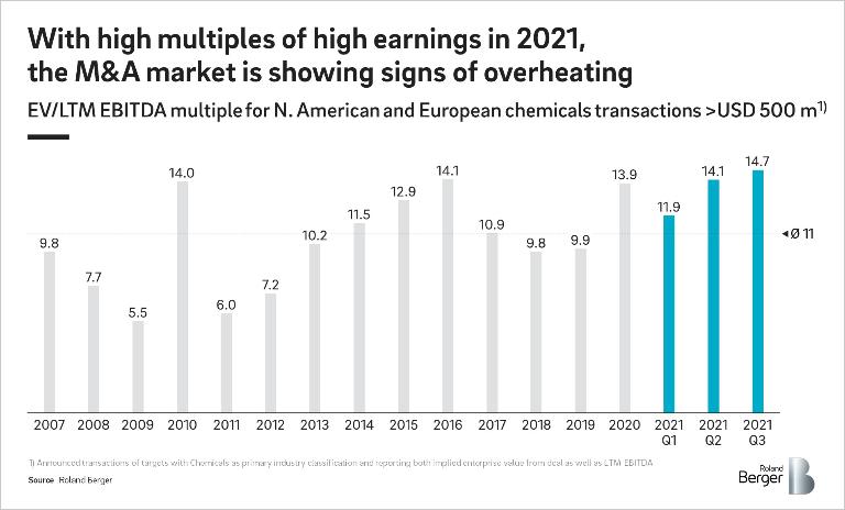 As a result of these trends, chemicals M&A activity is at an all-time high. For example, as we write this article, the number of deals above USD 500 m exceeds already previous peaks (reference chart 1). Valuations are also high by historical standards: recent transaction multiples - based on enterprise values divided by last twelve months’ earnings before interest, taxes, depreciation and amortization (EBITDA) - are 2-3 turns above their historical average despite being based on strong earnings (reference chart 2). With these high multiples of high earnings, the chemicals M&A market is overheating. And with continued portfolio shifts at chemicals companies and fundraising by private equity firms, it shows no signs of slowing down.