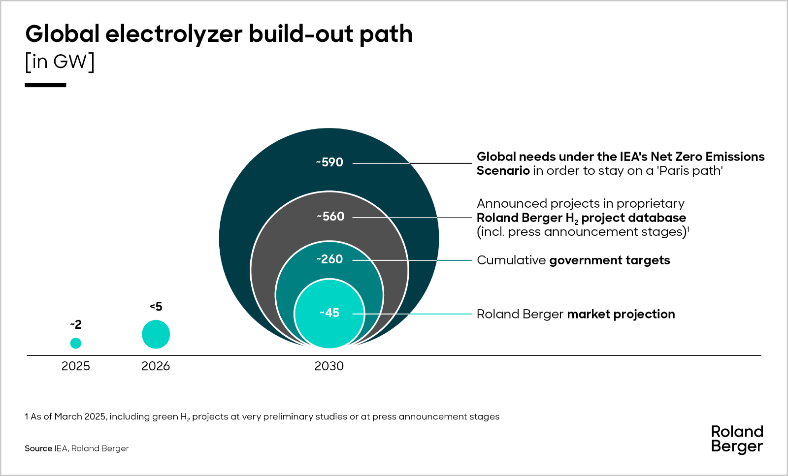Total announced green hydrogen production capacity, based on the latest project developments, may reach 560 GW by 2030. However, per Roland Berger’s assessment, which uses a probabilistic model considering project failure rates, expected cancellations and postponements, expects around 45-50 GW of installed electrolyzer capacity by 2030.