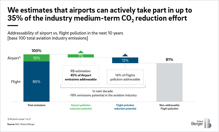 Making air transportation environmentally sustainable will require a joint effort by all players in the aviation industry ecosystem. While a large share of emissions is caused by flights, analysis by Roland Berger shows that as much as 35 percent of the CO2 that can be eliminated from the sector in the next decade will involve airports. Airports can play a critical role in enabling improved sustainability – and helping the aviation industry follow a roadmap to true zero.