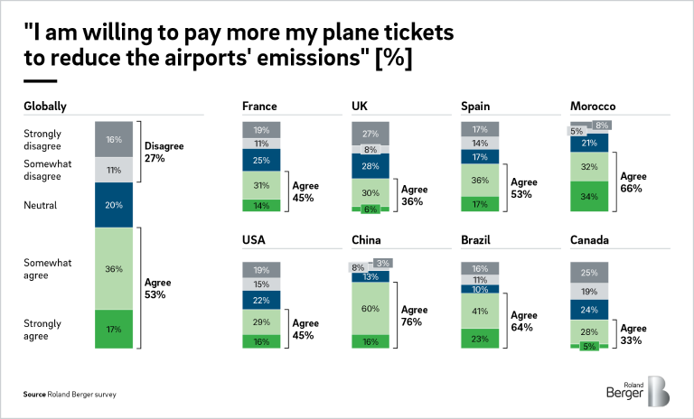 A survey of passengers conducted by Roland Berger in September 2022 in eight major countries – the United States, China, United Kingdom, France, Spain, Morocco, Brazil and Canada – reveals that around 60 percent of respondents believe that airports play a major role in air travel emissions, and need to act now. This confirms airports' role in passengers' imagination and the fact that they must embody the industry's transformation. The good news, backed up by the survey, is that as many as 53 percent of respondents are ready to pay more for their flights in order to help airports reduce their emissions. Interestingly, a significant number of passengers are ready to finance the transition regardless of which country they are in.
