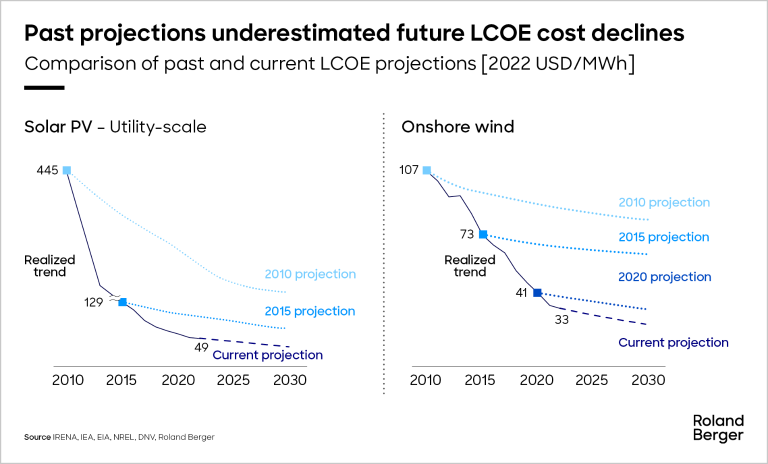 The briefest glance at the two charts above should at least give us pause for thought: Based on the industry’s track record of “future projections” about where the LCOE might reach its lower limits, we can at least claim consistency. Since at least 2010, the energy industry has repeatedly underestimated its capacity to realize further cost efficiency gains. Consequently, it has often perceived itself to be at an inflection point regarding the LCOE’s downward trajectory. The question must therefore be asked: Why should we be right this time?