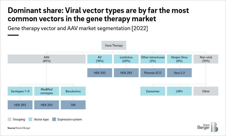 Exosomes: Extracellular vesicles produced by mammalian cells, exosomes can be used as vectors themselves or as an additional vector coating for increased transport function and immune evasion. Their manufacture can be based on existing viral vector processes. While they possess less than a 1% market share, exosomes are a growing technology due to their broad use base.