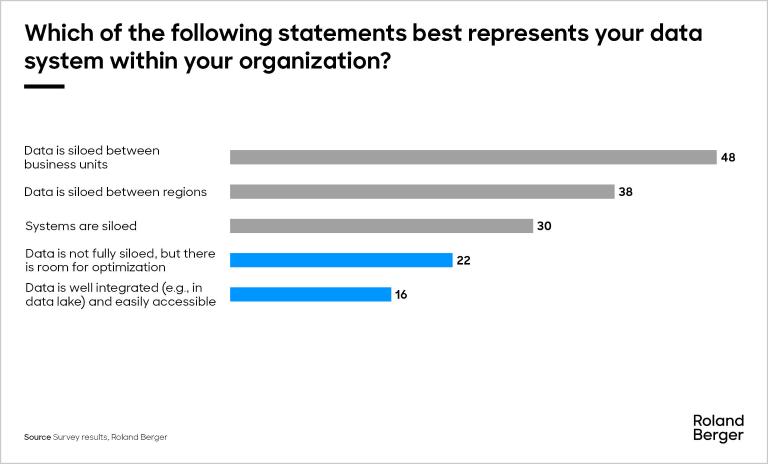One reason for these findings is that 24% of respondents reported not having a Chief Data Officer (CDO) or a similar role in their organization. Moreover, only 38% of participants perceive their company's systems as "not siloed" or only "partially siloed" (refer to ref c.), with nearly half identifying their systems as "siloed across business units," followed by "regions." Although regional silos are understandable due to GDPR (General Data Protection Regulation) restrictions (or equivalent), business unit silos are avoidable and are impediments that can be addressed with minimal effort, such as updating legacy data frameworks and associated processes.